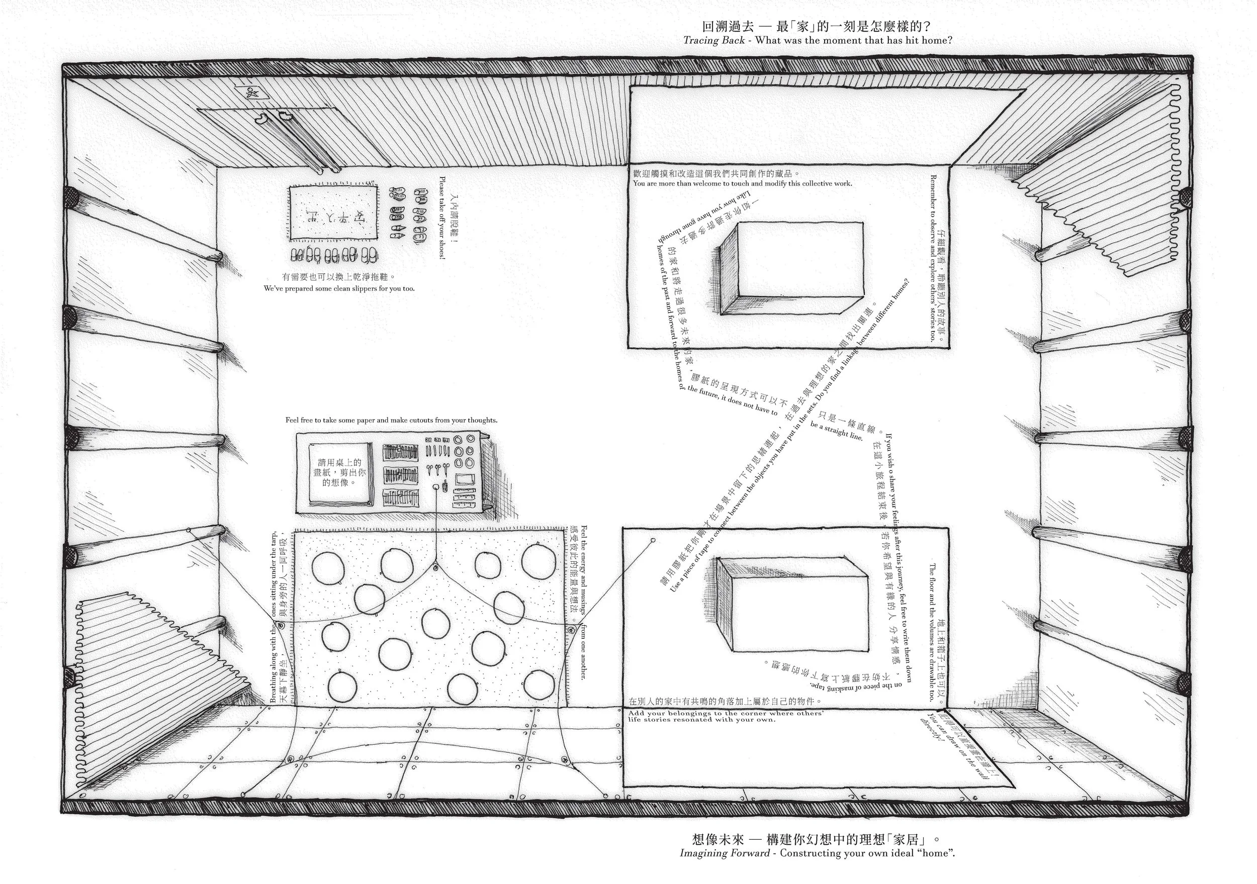 In two 1:1 imagined theatre sets, participants were invited to reconstruct memories and objects that have shaped them as a person on one of them, and their prospective treasured memories in their future homes. Collectively we have built a bulletin board that interweves everyone’s memories and celebrates the formative role of ‘home’ as a building block to who we are.