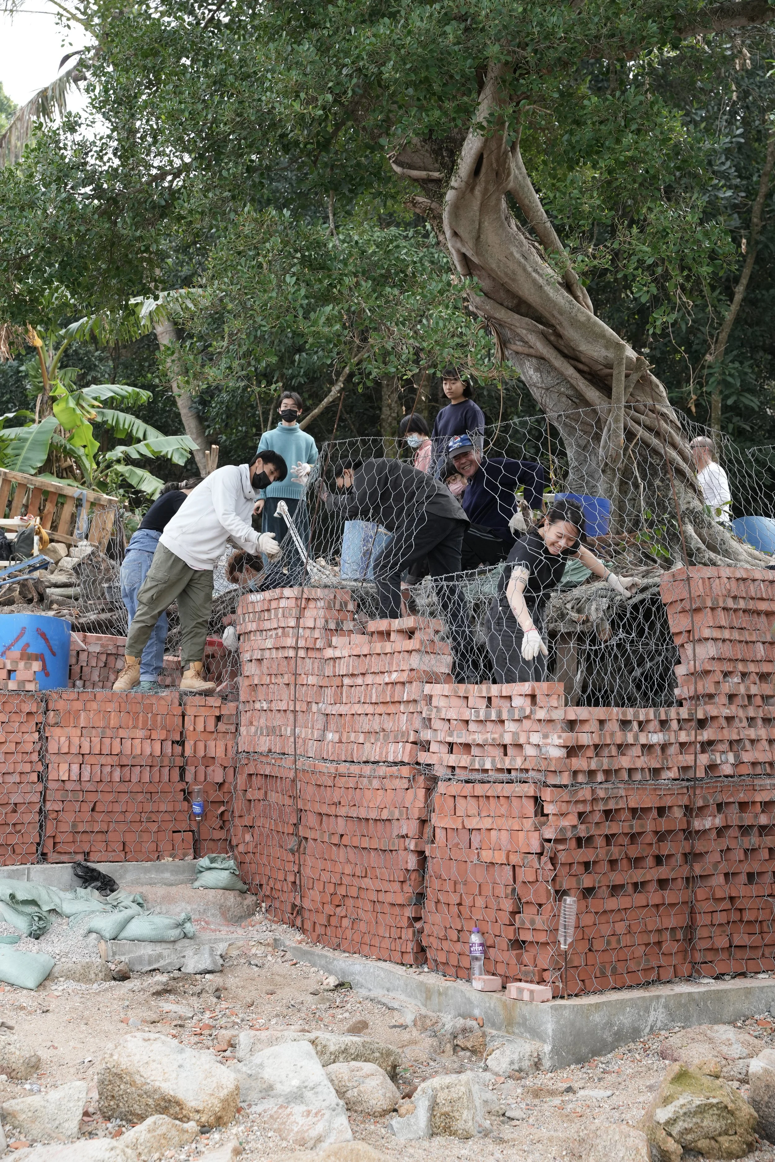 The construction took place every weekends, spanning from late 2021 to mid 2022. We spent one month on site formation and foundation casting, two months on setting gabion walls and backfill, and another two months for further strengthening the structure and finishing.